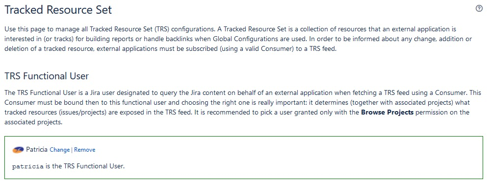If you change the TRS Functional User, you will need to re-build the TRS Resources (action enabled on the right of the above view), and in LQE, you will be forced to rebuild (see Check the status of the Jira Data Sources).