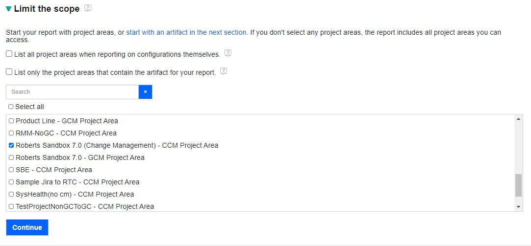 IMPORTANT: ReportBuilder uses Jazz Abbreviations for Project Scopes no matter the data source. Your Jira projects will have a - CCM Project Area even though they are from Jira. For example, a Jira project named ‘JIRA TEST’ will show up as follows: