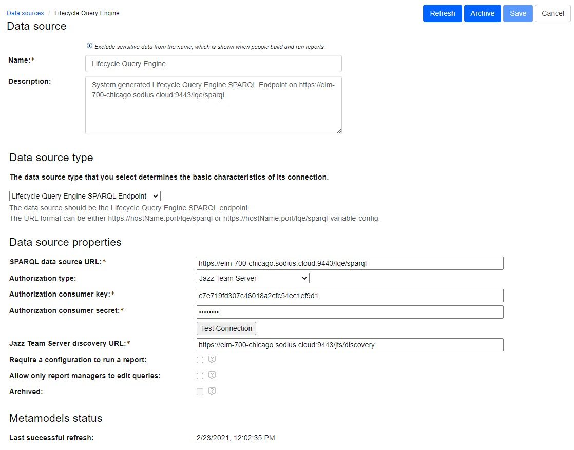 Once it has been determined that OSLC Connect provides a correct TRS feed and has the Functional User assigned, we must be assured that the data source is being read correctly in LQE.