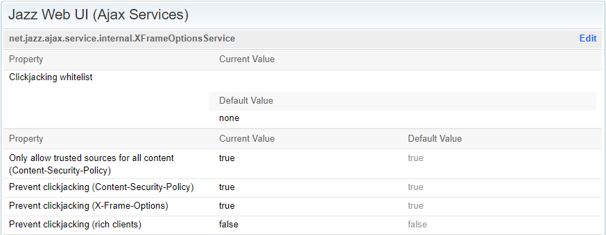 The core ELM product already provides clickjack prevention (see the section above) and does not need to be forced. When the headers are forced at the server or proxy level the OSLC collaboration will be prevented.